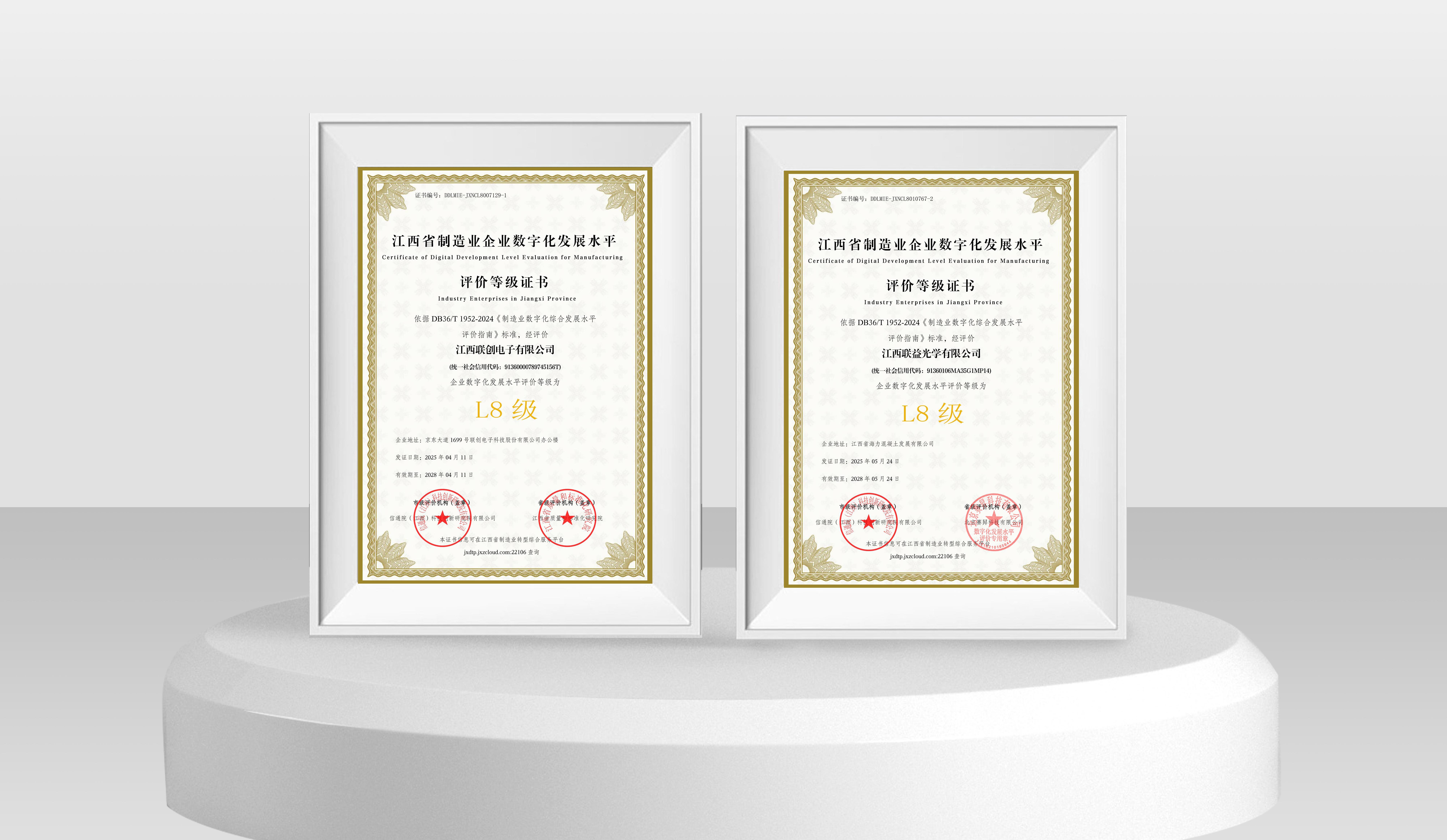 近日,万象城官方网站旗下江西联创电子有限公司(以下简称江西联创)与江西联益光学有限公司(以下简称江西联益)凭借深度集成与创新应用能力,在江西省制造业企业数字化发展水平等级评价中双双达到L8级水平,标志着两家企业在数字化转型领域已跻身全省“集成提升阶段”最高水平,为全省制造业智能化升级树立新标杆。